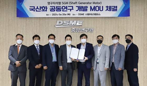 대우조선해양이 효성중공업과 협력해 친환경 기술력을 앞세워 선박의 핵심 장비로 꼽히는 축발전기모터 국산화에 나선다. 축발전기모터란 엔진 축의 회전력을 활용해 선박 추진에 필요한 전력을 생산하는 장비를 뜻한다.대우조선해양은 효성중공업과 '대용량 영구자석형 축발전기모터(SGM) 국산화 공동연구 개발'을 위한 양해각서(MOU) 체결식을 가졌다고 21일 밝혔다.대우조선해양 측은 "최근 환경규제가 점차 강화되면서 글로벌 해운업계에서는 이에 대응하기 위한 다양한 방안을 강구중"이라며 "이러한 가운데 축발전기모터는 발전기의 가동 의존도를 낮춰 연료 효율은 높이고 이산화탄소와 황산화물 배출량은 줄일 수 있는 대표적 친환경 신기술 중 하나로 꼽힌다"고 설명했다.양사는 지난 2019년 '유도기 방식'의 축발전기모터 국산화에 성공, LNG(액화천연가스) 운반선, LPG(액화석유가스) 운반선 및 초대형원유운반선에 이 시스템을 적용해 오고 있었다. 다만 대규모 용량이 필요한 컨테이너선의 경우 사실상 수입 제품에 의존할 수밖에 없었다.대우조선해양에 따르면 이 기술을 적용하면 기본적으로 연료 효율을 기존 대비 약 3% 높일 수 있고 상대적으로 크기가 작아 선형 변경에 따른 공간적 제약을 탄력적으로 극복할 수 있다.아울러 이번 연구 완료시 순수 국내 기술력으로 영구자석형 축발전모터를 조달할 수 있어 '핵심 장비 국산화'와 '수주 경쟁력 강화'란 두 마리 토끼를 모두 잡을 수 있게 된다.또 해외 제품과 유사한 수준의 성능을 확보하는데 필요한 시간과 비용도 줄일 수 있게 될 뿐만 아니라 컨테이너선을 포함한 모든 선종에 축발전기모터를 적용할 수 있게 된단 점에서 기대를 모으고 있단 설명이다.최동규 대우조선해양 전무는 "탄소 중립이란 시대적 요구에 발맞춰 각종 친환경 선박 기술 개발에 매진하고 있다"며 "이번 공동 연구로 해당 시장에서 기술 및 가격 경쟁력을 한층 높이고 동시에 선박용 핵심 장비 국산화를 통해 수주 경쟁력 제고에 기여할 것"이라고 강조했다.