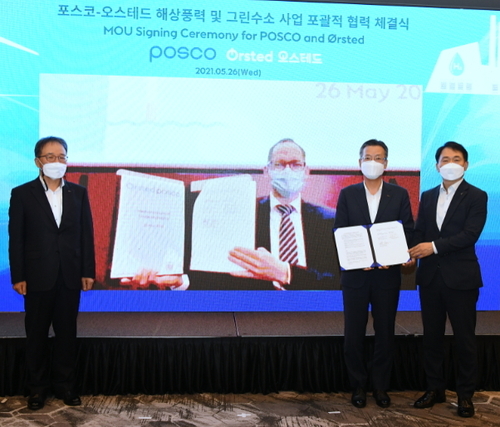 포스코그룹이 세계 최대 해상풍력발전 기업 오스테드(Orsted)와 사업 협력을 추진한다.포스코는 26일 세계 해상풍력발전 1위 업체인 덴마크 오스테드와 국내 해상풍력 및 그린수소 사업 포괄적 협력을 위한 양해각서(MOU)를 체결했다.포스코 및 포스코건설, 포스코에너지 등 그룹사의 역량을 결집해 해상풍력발전 및 연계 그린수소 사업 분야에서 오스테드와 협업키로 한 것이다.오스테드는 2026년 이후 상업운전 개시 예정인 사업비 8조원 규모의 국내 최대 1.6GW급 인천 해상풍력사업을 추진 중이다.포스코는 그간 오스테드의 영국 해상풍력발전 프로젝트 Hornsea 1, 2 등에 10만톤 이상의 강재를 공급한 바 있다. 다양한 글로벌 풍력발전 프로젝트에 강재 공급 협력 관계를 맺었다.이번 MOU를 통해 오스테드는 해상풍력 프로젝트를 개발하고 그린수소 생산 시설을 한국에 구축하게 된다. 포스코는 해상풍력발전 단지 구축에 필요한 철강재 공급과 함께 풍력발전을 활용한 그린수소생산에 참여한다.아울러 포스코건설은 해상풍력 구조물 건설, 포스코에너지는 그린수소 저장 및 수소 발전 등을 담당할 계획이다.전중선 포스코 전략기획본부장은 "포스코는 수소 사업을 차세대 미래성장 산업으로 선정하고, 그린수소 사업기회를 발굴하기 위해 노력하고 있다"며 "이번 오스테드와 사업 협력으로 그린수소 사업이 더욱 탄력을 받을 것"이라고 기대했다.이어 "그린수소 분야 글로벌 기업인 오스테드의 운영 노하우와 건설 및 에너지를 포함한 포스코그룹의 사업 역량이 결합되면, 양사가 Win-Win할 수 있는 시너지를 창출 하게 될 것"이라고 덧붙였다.