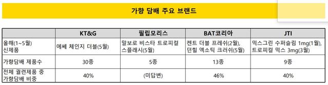 반면 담배 제조사들은 냄새저감, 저자극 트렌드에 따라 신제품을 출시할 수 밖에 없다는 입장이다. 실제로 가향 담배의 인기가 높아지자 KT&G를 비롯해 BAT코리아 등 국내·외 담배회사들은 이 같은 수요를 반영해 저자극 궐련 신제품을 확대하고 있다.