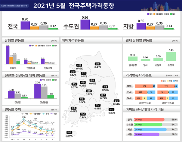 1일 한국부동산원이 발표한 '5월 전국주택가격동향조사'에 따르면 전국 월간 주택 종합(아파트·단독·연립주택 포함) 매매가격은 0.70%로 전월(0.71%) 보다 상승폭이 소폭 축소됐다.지난달 0.91%로 높은 상승률을 기록했던 수도권 집값도 0.86%로 상승폭이 줄었다. 다만 전달 상승폭이 축소됐던 서울(0.35%→0.40%)과 지방(0.52%→0.55%)은 상승폭이 확대됐다.