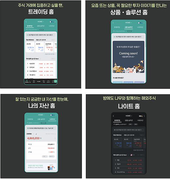NH투자증권은 모바일트레이딩시스템(MTS) 홈 화면을 사용자 중심으로 개편했다고 9일 밝혔다. NH투자증권은 고객들이 니즈에 맞게 사용할 수 있도록 나무(NAMUH)·QV 앱에서 트레이딩, 상품·솔루션, 나의 자산으로 세분화한 3단 홈 서비스를 제공한다.트레이딩에 집중하고 싶을 땐 ‘트레이딩 홈’, 뜨는 상품과 꼭 필요한 투자 이야기가 궁금할 땐 ‘상품·솔루션 홈’을 이용하면 된다.내 자산이 궁금할 때는 ‘나의 자산 홈’을 통해 자산 구성을 확인하고 자산관리가 가능하며 야간에는 ‘트레이딩 홈’이 해외주식에 최적화된 ‘나이트 홈’으로 자동 설정돼 해외주식 거래도 쉽게 가능하다.홈 서비스는 일평균 약 100만명의 고객이 이용할 만큼 이 회사의 대표 서비스다. 고객은 따로 로그인하지 않아도 ‘실시간 Best’ ‘투자고수’ 등 종목 정보와 AI를 활용한 종목 뉴스와 최근 이슈 뉴스 등을 간편하게 이용할 수 있다.또한 이번 앱 개편을 통해 업계 최초로 ‘스위처’ 기능도 도입됐다. 최신 UI·UX(사용자 인터페이스·경험)인 ‘스위처’는 MTS 오른쪽 하단의 퀵메뉴 단축키로 앱 화면 간 이동을 획기적으로 개선한 툴로, 쉽고 간편하게 최근 방문한 페이지 확인이 가능하다.특히 고객이 앱에서 자주 사용한 메뉴를 자동으로 집계해서 보여주는 기능 및 해외 거래 관련 메뉴 등을 통해 앱을 더욱 편리하게 사용할 수 있도록 했다. NH투자증권은 나이트홈 서비스, 스위처 개발 등을 시작으로 업계 내 다양한 최초 UI를 적용하며 향후 더욱 다양한 IT 기술을 활용한 혁신을 선보일 예정이다.이 회사는 새로워진 홈 서비스를 통해 고객이 지향하는 통합자산관리 플랫폼을 구축한다는 계획이다.고객들이 궁금해하는 다른 사람들이 많이 거래한 주식, 상품, 트렌드 정보를 지속해서 업데이트하고, 정확한 자산 진단 및 맞춤형 알림을 통해 고객이 MTS를 통해 손쉽게 자산관리를 할 수 있도록 할 예정이다.김두헌 디지털영업본부장은 “당사는 5월 기준 월간 활성 이용자(MAU) 322만명의 플랫폼 트래픽을 보유하고 있다”며 “이번 서비스 개편을 시작으로 앱 이용 고객의 다양한 관심사를 선제적으로 파악해 플랫폼을 통한 디지털 혁신 경험을 강화할 것”이라고 밝혔다.