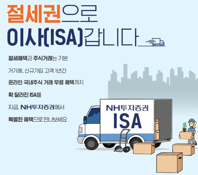 NH투자증권은 QV계좌를 이용하는 개인고객 대상으로 중개형 ISA 수수료 무료 이벤트를 진행한다고 7일 밝혔다.오는 12월 31일까지 중개형 ISA 신규가입 고객을 대상으로 계좌 내에서 1년간 주식매매 수수료와 유관기관 수수료까지 무료로 제공한다.QV ISA 가입 고객을 대상으로 선착순 증정 사은품 증정 이벤트도 진행한다. ISA를 최초로 개설하고 2000만원을 입금하는 고객 중 선착순 100명에게 GS주유상품권(5만원권)을, 신탁형 또는 일임형 ISA 1000만원 이상 가입한 고객 선착순 3000명에게 스타벅스 커피와 티라미수 케이크 세트를 증정한다.중개형 ISA의 경우 고객이 직접 주식을 매매하고, 상품을 거래할 수 있다는 점이 큰 장점으로 꼽힌다.개별 주식을 거래하면 주가 상승 시 수익과 함께 세제혜택을 동시에 누릴 수 있고, 손실이 발생하더라도 손실금액을 다른 상품의 이익에서 차감하는 손익 통산이 적용되기 때문에 일반 주식계좌와 비교 시 절세관점에서 매우 유리할 수 있다. ISA계좌는 연 2000만원씩 총 1억원까지 투자할 수 있고 수익과 손실을 통산해 주식이나 ETF매매와 더불어 금융상품을 거래한다면 매우 높은 세금 절약 누릴 수 있다.