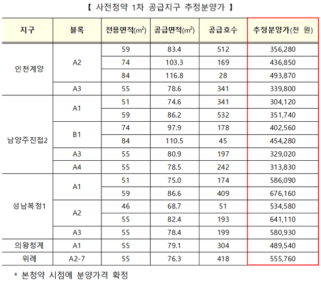 인천계양의 경우 3.3㎡당 약 1400만원 수준으로 전용면적 59㎡는 3억5600만원, 전용 84㎡는 4억9400만원으로 선출됐다. 남양주진접2는 3.3㎡당 약 1300만원 수준으로 가장 저렴하다.