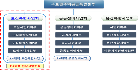 우선 2·4대책 현장전담조직인 '도심복합사업처'를 수도권주택공급특별본부에 신설하고 전문인력을 확충했다. 쌍문역 등 역세권과 수색동 등 저층주거지 등 도심 복합개발사업, 신설 1구역 등 공공재개발 사업을 속도감있게 추진하기 위해서다.