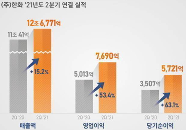 ㈜한화가 자체사업을 포함해 한화시스템 등 주요 자회사가 시장 전망을 웃도는 깜짝 실적에 힘입어 호실적을 달성했다.한화는 연결기준 올해 2분기 매출 12조6771억원, 영업이익 7690억원, 당기순이익 5721억원을 낸 것으로 잠정 집계됐다고 6일 공시했다.매출, 영업이익, 당기순이익이 전년도 같은 기간 대비해 모두 증가했다. 영업이익은 전년 동기 대비 53.4%, 당기순이익은 63.1% 오르며 성장세를 이어갔다.솔루션은 케미칼 부문이 선전하며 2조8000억원 규모의 역대 최대 분기 매출을 올렸다. 에어로스페이스는 군수와 민수사업 전반에 걸쳐 수익성이 개선되며 호실적을 달성했다. 생명도 연결기준 2분기 영업이익과 당기순이익이 전년 동기 대비 100% 안팎 증가했다.자체사업도 실적이 좋았다. 코로나19로 감소했던 장비 수요가 점차 증가하면서 제조 분야의 수익성이 높아졌고, 글로벌 부문도 석유에너지 사업 호조로 실적이 개선됐다. 한화건설 또한 대형 현장 신규 착공이 이어지며 호실적 달성에 일조했다.한화 관계자는 "하반기에도 글로벌 경기 회복, 자체사업 호조 등에 힘입어 성장세를 이어갈 전망"이라며 "이차전지 등 성장 산업 분야에서 수주 확대에 주력하고, 자회사를 통한 인공위성, 에어모빌리티 등 우주항공 분야의 신사업 진출로 중장기 성장동력을 확보해나갈 계획"이라고 말했다.