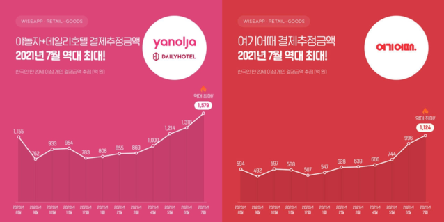 야놀자는 1579억원, 여기어때는 1124억원으로 외려 코로나19 이전보다도 금액이 늘었다.야놀자의 1~7월 금액도 7643억원으로 코로나 이전인 2019년 대비 35% 늘었다.여기어때의 7월까지 누적 금액도 5344억원으로 60%가 증가했다.