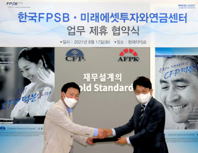 미래에셋투자와연금센터는 지난 17일 한국FPSB와 투자 및 연금 관련 콘텐츠 교류 등에 관한 업무협약을 체결했다고 18일 밝혔다.협약식에는 김경록 미래에셋투자와연금센터 대표와 조성목 한국FPSB 부회장 등이 참석했다.양 기관은 이번 협약을 계기로 다양한 분야에서 상호 협력관계를 구축하기로 했다.미래에셋투자와연금센터는 업무협약을 통해 다양한 콘텐츠들을 한국FPSB 온라인교육센터에 제공해 CFP(국제공인재무설계사) 및 AFPK(재무설계사) 자격자가 투자 및 연금 관련 지식을 지속적으로 업데이트할 수 있도록 도울 계획이다. 또한 양 기관은 콘텐츠 교류와 공동사업으로 상호 시너지 효과를 내기 위해 노력할 예정이다.김경록 대표는 “수명 연장으로 노후의 삶이 길어진 만큼 자산관리의 중요성이 날로 증가하고 있다”며 “투자와 적극적 연금 관리를 통해 투자자들이 성공적으로 노후를 준비할 수 있도록 한국FPSB와 함께 힘을 모으겠다”고 말했다.미래에셋투자와연금센터는 투자자들의 성공적인 자산운용과 평안한 노후준비를 위해 투자 및 연금 관련 다양한 콘텐츠를 개발해 공급하고 있다.한국FPSB는 CFP 및 AFPK 자격을 관리하고, 자격 인증자들이 금융전문가로 활동하는 데 필요한 교육과정을 운영 중이다.