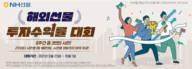 NH선물은 창립 29주년을 맞아 해외선물 실전 투자수익률 대회를 이달 23일부터 개최한다고 밝혔다.오는 10월 1일까지 총 6주간 개최되는 이번 대회는 2주 간격으로 총 3개의 시즌별 수익률 상위 1~3위에게 최대 100만원의 상금과 상장이 수여된다. 수익률 상위 4~10위에게는 베스킨라빈스 3만원 교환권이 지급된다.신청 대상은 개인 및 일반법인 투자자가 가능하며, NH선물 홈트레이딩시스템(HTS)을 통해 가능하다. 최종 수상자는 10월 8일 회사 홈페이지, HTS, MTS 공지사항을 통해 발표할 예정이다.대회기간 중 신규 계좌개설 고객에 대해서는 스타벅스 기프티콘을 증정하는 이벤트도 함께 진행된다.