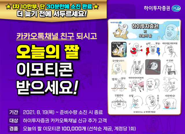 하이투자증권은 카카오톡 채널 등록시 이모티콘을 증정하는 이벤트를 추가로 진행한다고 19일 밝혔다.앞서 이 회사는 지난 17일 오후 2시부터 카카오톡 하이투자증권 채널을 등록한 고객 선착순 10만명에게 ‘오늘의 짤’ 이모티콘을 지급하는 이벤트를 진행한 바 있다. 이벤트는 오픈 30분만에 물량이 모두 소진되며 조기 종료됐다.추가 이벤트는 이날 오후 2시부터 선착순 10만명을 대상으로 진행된다. 1차와 마찬가지로 하이투자증권 계좌 보유 여부와는 무관하게 참여할 수 있으며, 1차 이벤트에 참여한 고객은 재참여가 불가능하다.