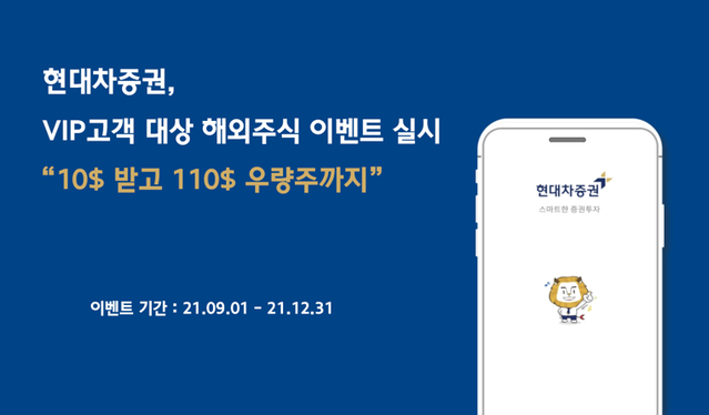 현대차증권이 VIP 고객 대상으로 해외주식 이벤트를 시행한다고 31일 밝혔다.이번 해외주식 이벤트는 10달러 제공 및 110달러 상당의 미국 우량주 1주 지급 이벤트로 9월 1일부터 12월 31일까지(4개월간) 진행된다.이벤트 기간 내 해외주식 서비스를 신청한 VIP고객 전원에게 10달러를 제공 한다. 별도의 참여 절차없이 전원에게 지급되며 서비스 신청일 차주에 해외주식 계좌로 자동 입금된다.또한 1000만원 이상 해외 주식을 매매한 VIP 고객 중 매월 50명(총 200명)을 추첨, 110달러 상당의 미국 우량주 1주를 지급한다. 쉐브론, AMD, IHS마킷 등 미국 대표 우량주 5종목 중 매월 첫째주 110달러에 가장 가까운 종목으로 결정된다. 단 이벤트 참여를 원하는 고객은 당첨 안내 수신을 위한 마케팅 수신 동의가 필요하다.이번 이벤트는 지난 7월 1일부터 진행 중인 ‘진짜진짜 미국 매수 수수료 제로’ 이벤트와 동시 진행된다. 전 고객을 대상으로, 미국 주식 매수 수수료 면제 및 매도 시 유관 수수료 면제 그리고 환전 수수료 99%할인 혜택 등을 제공 중이다.권지홍 리테일사업부장·상무는 “글로벌 투자자산에 대한 관심이 높아지는 상황 가운데 고객들의 성공적인 해외주식 투자를 응원하는 차원에서 이벤트를 마련했다”며 “향후에도 다양해진 고객들의 니즈 충족을 위해 노력하겠다”고 말했다.