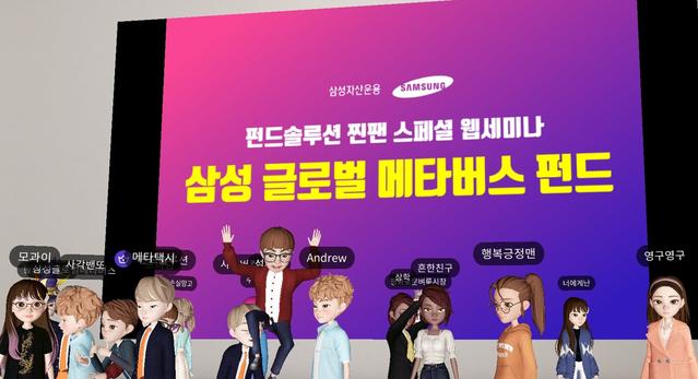 삼성자산운용은 지난 31일 업계 최초로 메타버스(metarverse) 플랫폼을 활용해 웹세미나를 진행했다고 1일 밝혔다.이번 웹세미나는 메타버스 기반 소셜 커뮤니케이션 서비스 이프랜드(ifland)에서 1시간가량 진행됐으며, 이 회사 모바일 펀드 비교 플랫폼 ‘펀드솔루션’ 우수회원 120명이 참여했다.세미나에선 삼성 글로벌 메타버스 펀드를 운용 중인 최병근 매니저가 직접 나와 메타버스 시장 전망과 펀드를 소개했다.이번 세미나에 참여한 회원들은 비대면이 일상화가 된 상황에서 메타버스를 활용한 새로운 시도에 신선하고 유익한 시간이었다고 평가했다고 회사 측은 밝혔다.송상윤 디지털마케팅팀장은 “이번 웹세미나는 코로나19 장기화로 대면 접촉이 어려운 상황을 감안해 가상현실인 메타버스에서 진행했다”며 “참가자들의 피드백을 고려해 향후 일반 투자자를 대상으로 확대할 계획”이라고 밝혔다.한편 지난 6월 28일 설정된 삼성글로벌메타버스 펀드는 출시 이후 투자자들의 꾸준한 관심을 받으며 2개월만에 설정액 610억원을 돌파, 4.4%의 양호한 수익률(31일 기준)을 기록 중이다.