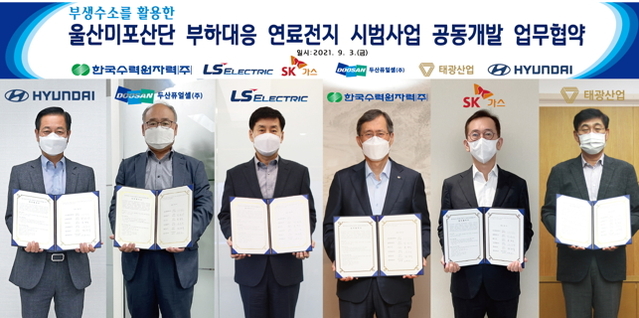 태광그룹 섬유·석유화학 계열사 태광산업이 한국수력원자력, LS일렉트릭, SK가스, 두산퓨얼셀, 현대자동차와 손잡고 부생수소를 활용한 부하대응 연료전지 시범사업 추진에 나선다.태광산업은 앞서 3일 이들 기업과 비대면으로 '울산미포산단 부하대응 연료전지 시범사업 공동개발을 위한 업무협약(MOU)'을 체결했다고 6일 밝혔다.향후 울산미포산업단지에서 발생하는 부생수소를 활용하는 연료전지 발전소 건설을 추진하기로 했다. 발전소 일부는 VPP 플랫폼과 연계하여 SMP(계통한계가격), 연료비 등에 따라 발전량을 조절하는 부하대응 방식을 시범 운영한다는 계획이다.협약에 따라 한수원을 비롯한 기업들은 앞으로 이와 유사한 사업모델이 적용되는 신규 사업 추진에도 함께 협력하기로 했다.이번 사업에서 태광산업은 원료인 부생수소를 공급한다. 부생수소는 석유화학 및 제철 등의 공정에서 발생하는 부산물 중 수소가 많이 포함되어 있는 혼합가스를 압력순환 흡착공정(PSA, Pressure-Swing Adsorption) 등으로 정제해 순도를 높여 생산하는 수소를 말한다.부생수소를 사용한 연료전지는 LNG를 원료를 하는 수소연료전지와 달리 이산화탄소가 배출되지 않아 대기오염을 줄일 수 있으며, 순도도 더 높아 안정적으로 가동할 수 있다는 장점이 있다.정찬식 태광산업 대표이사는 "이번 협약을 통해 울산 석유화학 단지의 부생수소를 활용하는 연료전지 사업의 성공적인 추진을 위해 협력하겠다"며 "향후 수소경제 활성화는 물론 ESG 경영에도 적극 노력할 것"이라고 밝혔다.