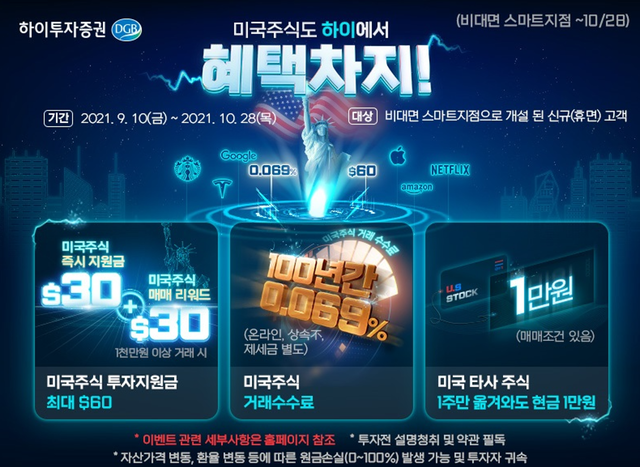 하이투자증권은 내달 28일까지 비대면(스마트 지점) 고객을 대상으로 비대면 미국주식 매매 이벤트를 진행한다고 10일 밝혔다.이벤트 기간 동안 미국주식 매매 서비스 및 이벤트 신청을 완료한 고객에게 매매 수수료를 100년간 0.069%로 제공한다. 미국주식 매매를 위한 투자지원금 30달러도 즉시 지급하며, 미국주식을 1000만원 이상 거래할 경우 30달러를 리워드 지급한다.또한 미국주식 실시간 시세 조회 서비스를 매매 서비스 신청 익월말까지 무료로 제공하며, 매월 1회 이상 매매할 경우 최대 1년간 무료로 서비스를 제공한다.타 증권사에 있는 미국주식을 하이투자증권 스마트 지점으로 이전하고 100만원 이상 매매할 경우에는 주식 순이전 금액에 따라 최대 20만원의 현금을 지급한다.