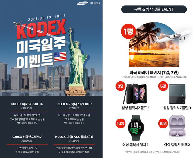 삼성자산운용은 KODEX 미국 ETF 4종을 거래하는 고객을 대상으로 이벤트를 진행한다고 13일 밝혔다.해당 ETF는 ‘KODEX 미국S&P500TR’, ‘KODEX 미국나스닥100TR’, ‘KODEX 미국반도체MV’, KODEX 미국FANG플러스(H)’ 등 4종이다.은행이나 증권사를 통해 해당 ETF 4종 상품 중 1주 이상을 거래 하고 보유 내역을 인증하면 1000명을 추첨해 백화점 상품권 1만원권을 증정한다. 기간은 이날부터 10월 12일까지이다.거래 내역 인증 고객 중 KODEX 알고투자 유튜브 채널을 구독하고 투자 후기를 댓글로 남긴 후 이벤트를 신청하면 미국 하와이 패키지, 삼성 갤럭시 Z플립3, 삼성 갤럭시 워치4 등을 지급하는 이벤트도 동시에 진행한다.이벤트는 중복 당첨이 가능하며 당첨자는 10월 29일 KODEX 홈페이지에 게시될 예정이다.