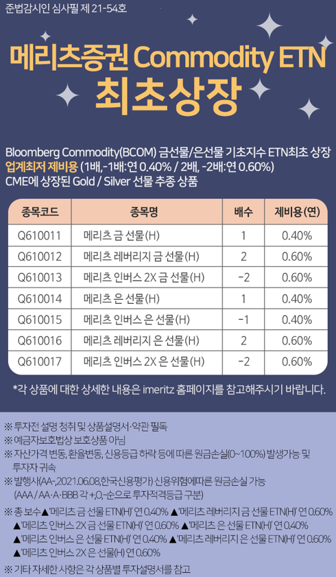 메리츠증권은 국내 최초로 블룸버그 원자재 지수(BCOM)를 추종하는 상장지수증권(ETN)을 출시했다고 14일 밝혔다.이번에 신규 상장된 ETN은▲'메리츠 금 선물 ETN(H)’ ▲'메리츠 레버리지 금 선물 ETN(H)’ ▲'메리츠 인버스 2X 금 선물 ETN(H)’▲'메리츠 은 선물 ETN(H)’ ▲'메리츠 인버스 은 선물 ETN(H)’ ▲'메리츠 레버리지 은 선물 ETN(H)’ ▲'메리츠 인버스 2X 은 선물(H)'등 총 7종목이다.해당 상품들은 미국상품거래소(COMEX)에 상장된 금·은 선물수익률을 기초지수로 한다. 금∙은 선물 각각의 일간 수익률 -2배에서 +2배까지 투자가 가능하다. 환헤지를 통해 환율 변동 위험 없이 거래가 가능하며 만기는 5년이다. 제비용은 연 0.40%~ 0.60%로 금·은 선물 관련 ETN 상품 중 업계 최저 수준이다.이중훈 파생본부장은 “투자자들이 원자재 ETN에 장기 투자 시 비용 부담을 줄일 수 있도록 제비용을 업계 최저 수준으로 결정했다"면서 "향후에도 시장의 투자 수요를 충족시킬 수 있는 다양한 ETN 상품을 출시해 상품 라인업을 강화할 계획”이라고 설명했다.