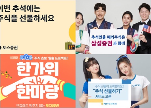 증권사들이 추석을 앞두고 연휴 대목을 이용한 각양각색 서비스로 각축전을 벌이고 있다. 명절을 맞아 주식 선물하기 서비스를 새롭게 선보이거나, 휴장하는 국내 증시 대신 해외 증시 유입으로 이어지도록 연휴 서비스 지원을 확대하고 투자공부 콘텐츠를 선보이는 등 투심 확보를 위해 부지런한 모습이다.17일 증권업계에 따르면 토스증권과 NH투자증권은 추석 연휴를 앞두고 주식 선물하기 서비스를 잇따라 선보였다.토스증권은 기존 주식 선물하기 서비스의 추석 명절용 버전인 주식백화점을 오픈했다. 이는 추석 선물로 인기있는 브랜드를 다루는 기업들로 구성되며, 모바일트레이딩시스템(MTS)을 통해 오는 22일까지 운영된다.식품관·리빙관·문화센터 총 3층으로 구성된 주식백화점은 명절 선물로 인기가 많은 건강기능식품·화장품·영화관 등 9가지 카테고리의 제품들을 소개한다. 이번 서비스는 기존 토스증권의 '주식 선물하기'를 명절 맞춤형으로 만든 것이다.NH투자증권도 지난 16일부터 MTS를 통해 고객이 보유한 주식을 선물하는 서비스를 개시했다. 또한 모바일증권 나무(NAMUH)를 통해 미국주식 1주를 랜덤으로 지급하는 '나무에서 해외 브랜드 주식을 선물로' 이벤트를 진행하고 있다.이를 통해 투자가 일상과 문화로 자리잡을 수 있도록 노력을 기울인다는 방침이다.국내 증시는 휴장하지만 해외 증시는 정상 운영되는 만큼 서학개미 투자자를 위한 서비스 지원도 확대된다.삼성증권은 이번 추석 연휴와 9월 연방공개시장위원회(FOMC)가 겹쳐 실시간으로 투자 리스크에 대응하고자 하는 투자자들의 늘어난 니즈를 반영해 서비스를 강화해 운영한다는 방침이다.오는 20~22일 추석 연휴 기간 동안 지점 문을 열지 않지만 신규로 계좌를 개설하고 해외투자를 시작할 수 있다. 해외주식 데스크 운영과 더불어 심야에도 환전할 수 있도록 24시간 환전 서비스도 운영한다.대신증권도 연휴기간 해외주식 거래를 위한 해외주식 데스크를 24시간 운영한다. 거래 가능국가는 미국·홍콩·일본 등 16개국이다. 다만 미국·홍콩·일본 3개국은 온라인 거래와 해외주식데스크를 활용해 오프라인 거래가 가능하지만 중국은 17일부터 22일, 홍콩은 22일, 일본은 20·23일 휴장한다.독특한 콘셉트의 투자 교육 프로그램과 이벤트를 통해 개인투자자들의 여유로운 연휴를 공략하기도 한다.삼성증권은 추석 연휴 기간 투자교육 과정을 수료하면 경품을 제공하는 '주식초보 탈출 프로젝트'를 진행한다. 이 회사는 전국민 투자 지식 레벨업 프로젝트의 일환으로 모바일 동영상 투자교육 사이트를 론칭한 바 있다.해당 콘텐츠엔 회사 캐릭터인 '다비다'가 교장 선생님으로, 당사 리서치센터 소속 애널리스트 등이 출연한다. 투자지식 테스트 결과에 따라 초급·중급·고급 과정 중 본인 단계에 맞는 과정부터 순차적으로 수강할 수 있다. 전 과정 수료 시 참여할 수 있는 이번 이벤트를 통해 스마트워치, 주유상품권 등 각종 경품이 제공될 예정이다.증권사들이 명절 연휴를 이용해 각종 마케팅에 나선 이유는 추석 등 명절 기간 해외주식 투자에 뛰어드는 적극적인 투자자들이 크게 늘고 있기 때문이다.