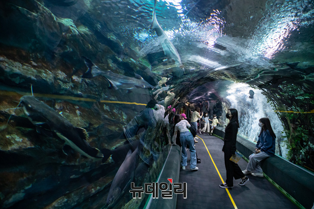 23일 서울 송파구 롯데월드 아쿠아리움을 찾은 손님들이 메인 수조 '디오션'에서 해양생물들을 바라보고 있다.롯데월드 아쿠아리움은 국내 최장 길이의 수중 터널, 국내 최대 크기의 메인 수조를 보유하고 있고 전 세계 650종 5만 5천여 마리의 해양생물들을 만나볼 수 있다.또 국내 최초로 아기 훔볼트 펭귄의 성장 및 사회화 훈련을 엿볼 수 있는 '아기 펭귄 유치원', 호러 콘셉트로 작은발톱수달의 먹방 ASMR을 들려주는 생태설명회 '너의 목소리가 들려' 등 이색적인 볼거리도 가득하다. (사진=롯데월드)