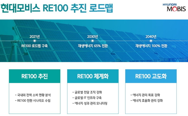 현대모비스가 'RE100(Renewable Energy 100%)' 추진 로드맵을 마련했다. 국내 자동차부품 기업으로선 처음이다.RE100은 2050년까지 기업 사용 전력량의 100%를 재생에너지로 전환하는 세계적 캠페인이다. 현대모비스는 이 기준보다 10년 앞당긴 2040년까지 100% 전환을 목표로 잡았다.최근 현대모비스는 현대차, 기아 등 현대차그룹 5개사와 함께 RE100 추진을 선언했다. ESG 경영이 강조되는 가운데, 탄소 중립 실현을 위한 적극적인 환경경영 의지를 드러낸 것이다.현대모비스의 목표는 2030년 65%, 2040년 100% 달성이다. 먼저 사업장 소재 국가별로 전력 소비 현황을 분석해 재생에너지 전환 시나리오를 수립했다. 해외를 중심으로 2030년 65% 이상으로 끌어올린 뒤 전환이 비교적 까다로운 국내를 포함해 2040년까지 100%를 달성할 계획이다. 이 회사는 슬로바키아와 스웨덴 사업장에서는 이미 100% 재생에너지를 사용하고 있다.재생에너지 전환 전략은 각 국가별 규제와 사회환경을 고려해 마련됐다. 재생에너지는 직접 생산하거나 외부에서 구매 할 수 있다. 직접 생산은 태양광 발전, 풍력 발전 등 기업이 자체 재생에너지 설비를 설치해 사용하는 방식이다.