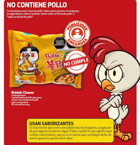 연방소비자보호청은 매운 치즈맛 닭고기 라면이라고 표기하고, 실제 표기 성분 상엔 가공 닭고기맛 분말과 가공 닭고기맛만 함유돼 있다고 지적했다.