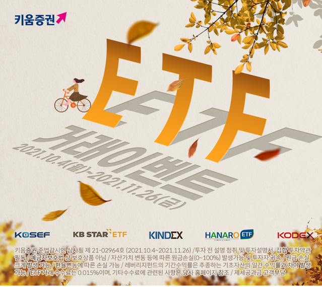 키움증권은 ETF 거래이벤트를 지난 4일부터 11월 26일까지 실시한다고 6일 밝혔다.해당 이벤트는 키움투자자산운용, KB자산운용, 한국투자신탁운용, NH아문디자산운용, 삼성자산운용과 함께 진행한다.ETF를 처음 거래하는 고객과 기존 거래고객 모두를 위한 3가지 세부 이벤트로 구성된다.신규 ETF 거래고객 중 2000명을 추첨해 백화점상품권을 지급하는 첫(휴면)거래이벤트, 일일 ETF 거래에 따라 경품을 추첨 지급하는 일일 거래이벤트, 자산운용사별 종목 거래에 따라 경품을 지급하는 종목 거래이벤트가 준비됐다.일일 거래이벤트는 경품 추첨 조건 달성 고객을 대상으로 매일 스타벅스 아메리카노를 추첨 증정하며, ETF 거래금액 달성 고객 중 상위 고객에게 상금을 지급한다.운용사별 ETF 이벤트는 각 자산운용사의 ETF 종목들의 거래조건 달성 시 문화상품권을 지급한다.이벤트 접수는 키움증권 홈페이지, 모바일 홈페이지를 통해 신청이 가능하다.