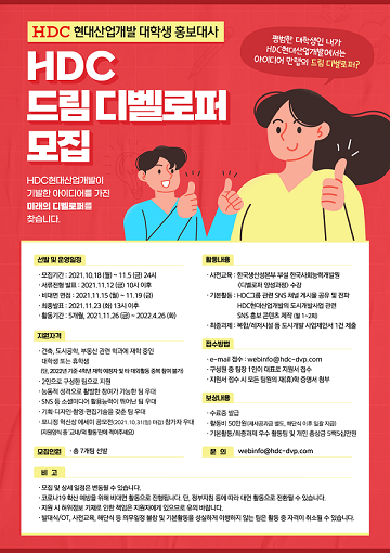 HDC현대산업개발이 개발사업 우수인재 선점에 나섰다.HDC현대산업개발은 오는 18일부터 내달 5일까지 건축, 도시공학, 부동산 관련 전공 대학생 대상 제1기 HDC 드림 디벨로퍼를 모집한다고 13일 밝혔다.HDC현대산업개발이 처음 선발하는 HDC 드림 디벨로퍼는 5개월 동안 복합개발 사례를 배우고 도시 공간에 대해 성찰하는 시간을 갖는다.모든 참여자는 한국생산성본부 부설 한국사회능력개발원이 제공하는 디벨로퍼 양성교육을 수강하고 HDC현대산업개발 개발영업본부 실무자에게 멘토링도 받을 수 있다.HDC 드림 디벨로퍼는 2명으로 팀을 구성한 뒤 대표자 1명이 이메일 로 접수할 수 있다. 서류전형과 비대면 면접을 거쳐 최대 10개 팀(20명)을 선발하고 활동 수료자와 우수활동 팀은 소정의 활동비를 지원받는다.회사 담당자는 "HDC현대산업개발은 공간이 지닌 잠재력을 끌어내고 도시에 새로운 활력을 불러일으키는 다양한 개발사업을 추진해 리얼 디벨로퍼로 성장하는 중"이라며 "도시개발 특화 홍보대사 프로그램인 HDC 드림 디벨로퍼와 미래의 꿈을 현실로 만들어갈 젊은 인재들을 기다린다"고 밝혔다.