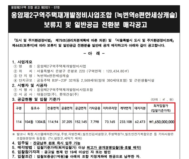19일 정비업계에 따르면 응암2 재개발조합은 서울 은평구 은평로 220 일원에 위치한 녹번역 e편한세상캐슬 104동 1304호(전용 114㎡) 공개경쟁입찰에 대한 5차 매각공고를 냈다. 최저입찰가격은 3·4차 때와 같은 16억5000만원이며 입찰은 오는 21일부터 22일까지 이틀간이다.