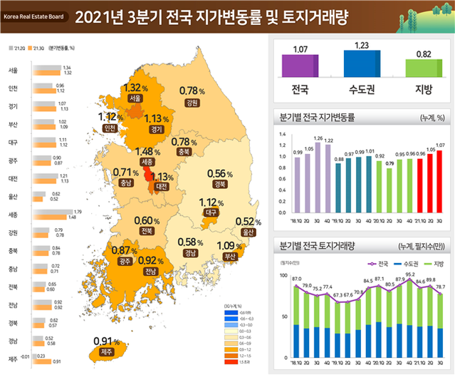 25일 국토교통부가 발표한 3분기 전국 지가변동률에 따르면, 올해 3분기 전국 지가는 1.07% 상승해 2분기(1.05%) 대비 0.02%포인트(p), 지난해 3분기(0.95%) 대비 0.12%p 확대됐다. 올들어 3분기까지 누계로 3.12% 상승해 전년동기(2.69%) 대비 0.43%p 높은 상황이다.