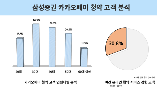 삼성증권은 지난 25일부터 기업공개(IPO) 대표 주관을 맡아 진행한 카카오페이 공모주 청약에 약 82만 계좌가 몰렸다고 27일 밝혔다.카카오페이 공모주 청약 신청은 삼성증권을 포함해 총 4개사 기준 182만건으로 집계됐다.전체 청약 신청자 중 과반에 가까운(44.8%) 청약 건이 삼성증권을 통해서 진행됐다.이는 신청된 청약 신청 당일에 계좌를 개설하는 경우에도 공모주 청약이 가능해진 점, 간편 투자 앱 '오늘의 투자' 등 다양한 서비스를 제공했기 때문이란 게 회사 측 분석이다.청약고객을 특성별로 분석해 보면, 30대(26.3%)가 21만4000여명으로 가장 많았고 그 뒤를 이어 40대(24.1%)와 50대(20.4%)가 카카오페이에 많은 청약을 신청한 것으로 나타났다.뿐만 아니라 청약 기간 동안 신규로 삼성증권에 계좌를 개설해 카카오페이 청약에 참여한 고객이 약 11만명으로, 이는 전체 청약 고객 중 13.7% 수준이다.삼성증권은 청약 첫날 오후 10시까지 야간 온라인 신청을 받았는데, 30~50대의 야간 청약율이 전체 야간 청약 건수의 67.6%를 차지했다.사재훈 채널영업부문장 부사장은 "올 하반기 들어 증시가 박스권에 갇히며 공모주 열풍 역시 잠시 주춤했던 것이 사실"이라며 "그럼에도 카카오페이와 같은 빅딜에는 여전히 많은 고객이 청약을 신청해 똘똘한 공모주를 선별하는 스마트한 고객이 늘어나고 있는 현상이 목격되고 있다"고 밝혔다.