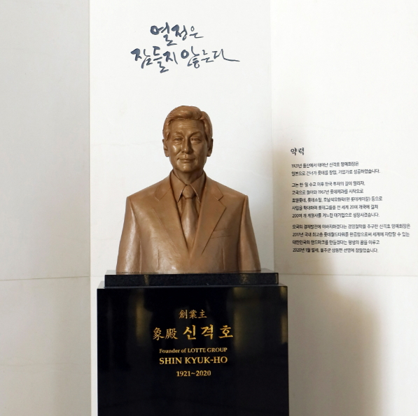 롯데그룹의 창업주 고(故) 상전(象殿) 신격호 명예회장의 업적과 철학이 탄생 100주년을 맞아 재조명된다. 상전은 신 명예회장의 호다.신동빈 회장은 1일 기념관 개관식에서 "신격호 명예회장은 대한민국이 부강해지고 우리 국민이 잘 살아야 한다는 굳은 신념으로, 사회와 이웃에 도움이 되는 기업을 만들고자 노력했다"며 "롯데는 더 많은 고객에게 꿈과 희망을 주는 기업으로서 사회적 역할을 다해야 한다"고 강조했다.이날 롯데는 신격호 창업주의 도전정신을 계승하기 위해 롯데월드타워에 흉상을 설치하고, 기념관을 만들었다.흉상은 좌대 포함 185cm 높이로, 청동으로 제작됐으며 롯데월드타워 1층에 전시된다. 광화문 세종대왕상, 동대문 DDP 대형인체조각 등으로 널리 알려진 김영원 조각가가 제작을 맡았다. 흉상 뒤에는 '열정은 잠들지 않는다'는 메시지를 강병인 서예가의 글씨로 담았다.'상전 신격호 기념관'은 롯데월드타워 5층에 약 680m² 규모로 마련됐다. 이곳에서는 신격호 창업주가 일궈낸 롯데의 역사를 미디어 자료와 실물 사료로 확인할 수 있다.창업주의 일대기를 포토그래픽으로 구성했으며, 초기 집무실도 재현됐다. 집무실에는 '화려함을 멀리하고 실리를 추구한다'는 뜻의 사자성어인 '거화취실(去華就實)', 그리고 한국 농촌의 풍경이 담긴 그림이 액자로 걸려있다. 신격호 명예회장의 소박한 성품과 모국에 대한 사랑을 엿볼 수 있다.신 회장은 "새로운 롯데를 만들어가는 길에, 명예회장이 몸소 실천하신 도전과 열정의 DNA는 더없이 소중한 자산이 될 것"이라며 "명예회장의 정신을 깊이 새기면서, 모두의 의지를 모아 미래의 롯데를 함께 만들어 나가자"고 강조했다.롯데는 국가 발전에 기여하고, 국민 생활을 윤택하게 만들고자 했던 창업주의 생애를 다양한 각도에서 돌아볼 수 있는 기념행사를 개최한다.또한 신격호 창업주가 청년시절 일본에서 고학하며 롯데를 창업한 과정에서 있었던 6가지 주요 일화를 일러스트 영상으로 구성했다. '라이브 드로잉의 대가'로 불리는 김정기 작가가 롯데의 발전상을 감각적으로 그려낸 대형 드로잉 영상도 감상할 수 있다.생전 창업주가 신고 현장을 누볐던 낡은 구두와 돋보기, 안경집, 펜과 수첩 등의 집무도구, 명함과 파이프 담뱃대, 즐겨보던 책과 영화 테이프 등도 눈길을 끈다. 롯데제과 최초의 껌 '쿨민트'부터 롯데백화점 초기 구상도, 롯데월드타워 기록지까지 사업의 성공을 위해 치열하게 고민했던 흔적을 확인할 수 있다.