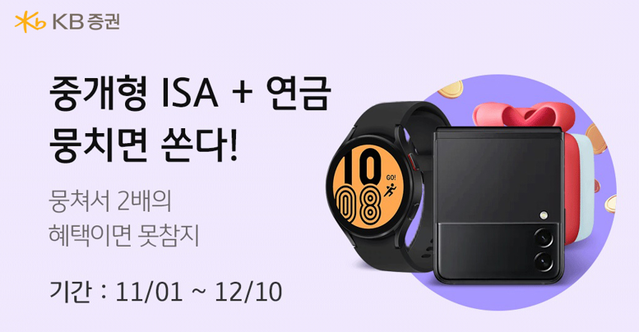 KB증권은 비과세 혜택과 절세효과를 누릴 수 있는 중개형 ISA와 연말정산을 준비하며 주목받는 연금(개인연금·IRP) 고객을 대상으로 이벤트를 시행한다고 1일 밝혔다.이번 이벤트는 KB증권에서 중개형 ISA와 개인연금을 모두 거래하면 풍성한 경품 및 혜택을 제공하는 이벤트이다.중개형 ISA와 개인연금 계좌 모두 KB증권 신규 고객이거나 타사에서 이전한 고객에게 추첨을 통해 이벤트 기간 동안 매월 30명씩 갤럭시 Z 플립과 갤럭시 워치를 함께 증정한다.개인연금 계좌 순입 금액 구간별로 국내 주식 쿠폰 최대 3만원·신세계 모바일 상품권 최대 15만원을 증정한다. 이때 중개형 ISA가 KB증권에 개설된 경우 개인연금 순입금액 기준으로 받을 수 있는 쿠폰과 상품권을 2배로 증정한다.중개형 ISA와 IRP도 개인연금과 마찬가지로 순입금액을 기준으로 각각의 이벤트 조건을 충족하면 국내 주식 쿠폰과 신세계 모바일 상품권을 증정한다. 단 순입금액 기준 이벤트 혜택을 받기 위해서는 12월 10일까지 잔고를 유지해야 한다.본인의 투자 유형을 MBTI로 진단받고 투자에 대한 조언까지 확인할 수 있는 이벤트도 준비됐다. MZ세대의 이목을 끌고 공감을 이끌어내는 MBTI와 투자 유형 진단받는 것을 접목시킨 ‘부자 MBTI’에 참여한 고객 전원에게 국내 주식 쿠폰 5000원권을 증정한다. 주식 쿠폰을 사용한 고객 대상으로 추첨을 통해 총 50명에게 갤럭시 워치를 증정한다.이홍구 WM총괄본부장은 “KB증권 모든 고객이 절세 혜택을 누리며 투자를 하고, 노후 준비에도 도움이 될 수 있도록 좋은 상품과 서비스 제공을 통해 고객 자산관리에 도움되도록 노력하겠다”며 “앞으로도 다양한 고객층이 폭 넓게 참여할 수 있는 이벤트와 마케팅을 적극적으로 펼쳐나갈 예정”이라고 말했다.