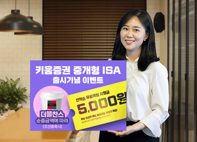 키움증권은 ‘중개형 ISA 출시 기념’ 이벤트를 진행한다고 1일 밝혔다.이번 이벤트는 키움증권 중개형 ISA계좌를 개설한 선착순 10만명에게 투자를 체험해 볼 수 있는 무료체험 지원금 5000원을 지급하며, 100만원 이상 입금만 해도 순증금액에 따라 투썸플레이스 모바일 기프티콘(최대 3만원)을 지급한다.이는 비대면 계좌개설 후 ISA 앱 또는 홈페이지 ISA 계좌개설 화면을 통해 쉽게 만들 수 있으며 일반 계좌와 동일하게 MTS(영웅문S)와, HTS(영웅문) 등을 통해 편리하게 거래할 수 있다.회사 관계자는 “국내주식 및 다양한 금융상품을 직접 투자할 수 있는 중개형 ISA를 지금부터 준비해서 연간 납입한도 2000만원도 확보하고 이벤트를 통해 다양한 혜택도 누리길 바란다”고 말했다.이벤트에 대한 자세한 사항은 홈페이지를 참고하거나 키움금융센터로 문의하면 된다.