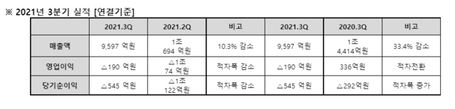 매출 9597억원, 당기순손실 545억원조업일수 감소로 매출도 줄어환율 상승에 그나마 선방