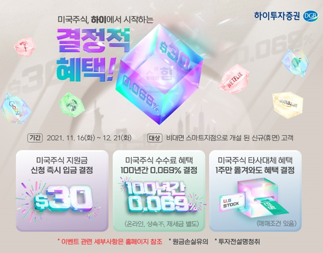 하이투자증권은 내달 21일까지 비대면(스마트 지점) 고객을 대상으로 비대면 미국주식 매매 이벤트를 진행한다고 16일 밝혔다.이벤트 기간 동안 미국주식 매매 서비스 및 이벤트 신청을 완료한 고객에게 매매 수수료를 100년간 0.069%로 제공하며, 투자지원금 30달러를 즉시 지급한다.실시간 시세 조회 서비스도 매매 서비스 신청일로부터 익월말까지 무료로 제공하며, 매월 1회 이상 매매할 경우 최대 1년간 무료로 서비스를 제공한다.추가로 타 증권사에 있는 미국주식을 하이투자증권 스마트 지점으로 이전하고 100만원 이상 매매할 경우에는 주식 순이전 금액에 따라 최대 20만원의 현금을 지급한다.