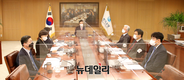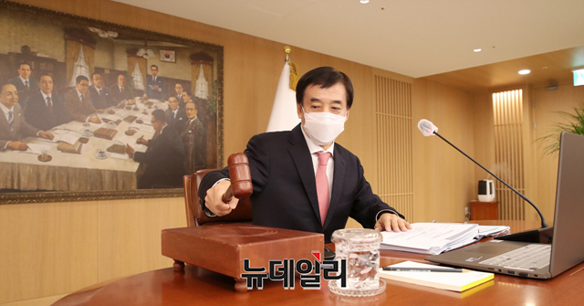 이주열 한국은행 총재가 25일 오전 서울 중구 한국은행에서 열린 금융통화위원회 본회의에서 회의를 주재하며 의사봉을 두드리고 있다.
