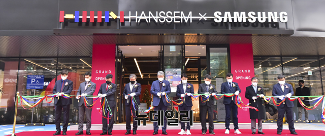 강승수 한샘 대표이사 회장, 이영식 부회장을 비롯한 참석자들이 9일 오전 서울 마포구 한샘디자인파크 마포점 그랜드 오픈행사에서 커팅식을 갖고 있다.