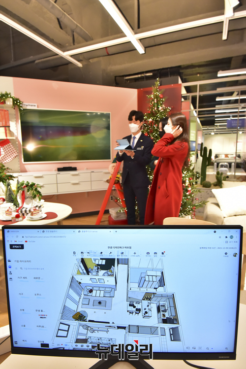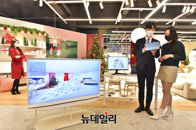 한샘디자인파크 마포점이 개장한 9일 오전 서울 마포구 매장에서 직원들이 메타버스 인테리어를 시연하고 있다.