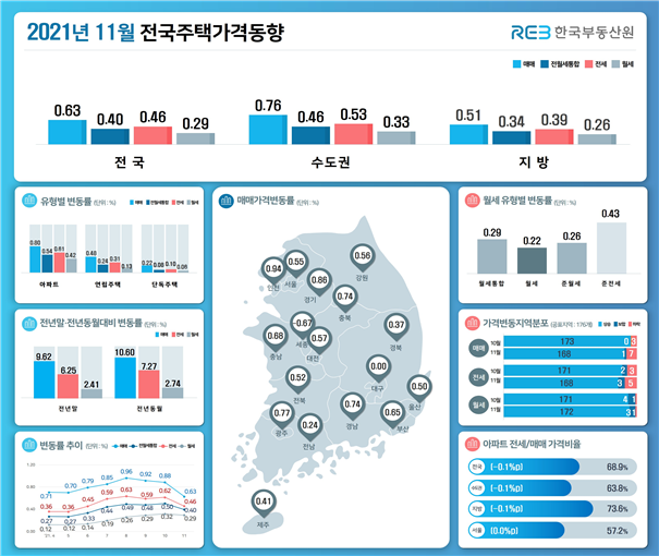 15일 한국부동산원의 '11월 전국주택가격동향조사'에 따르면 지난달 전국 주택종합(아파트·단독·연립주택) 매매가격은 0.63% 상승해 전월(0.88%) 대비 상승폭이 축소됐다. 상승세 둔화는 9월부터 석 달째 계속되고 있다.