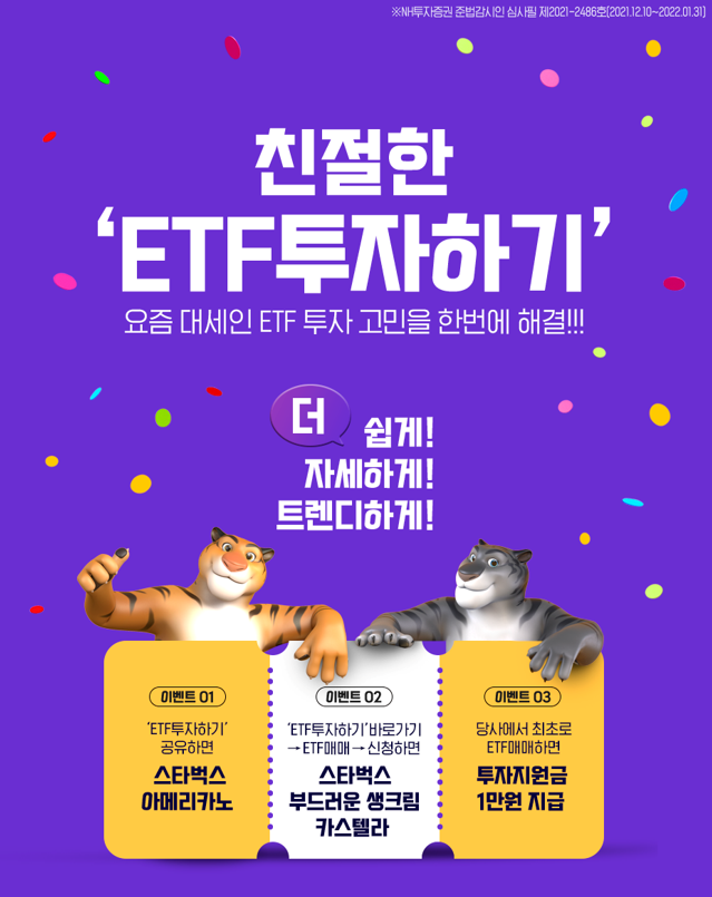 NH투자증권은 20일부터 내달 31일까지 QV 모바일트레이딩시스템(MTS)을 이용하는 고객 대상으로 ‘ETF 투자하기’ 이벤트를 내년 진행한다고 밝혔다.이 회사는 국내 상장지수펀드(ETF)에 대한 정보를 한데 모아 고객들의 ETF 투자를 돕기 위해 ETF 투자하기 메뉴를 지난 11월 전면 개편했다.자체적인 ETF 데이터베이스를 구축해 어렵고 긴 상품 설명 대신 쉽고 간략한 설명, 트렌디한 키워드로 관련 상품 찾기, 수익률뿐 아니라 보수율 순으로도 정렬하기, 두 상품을 선택해 서로 비교하기 등으로 타사와 기능을 차별화했다.특히 연말 세테크 중심인 개인연금, 퇴직연금, 개인종합자산관리계좌(ISA)에 활용도가 높은 상품이어서 연금자산관리 니즈가 있는 고객이 ETF 투자를 효율적으로 할 수 있도록 상세한 정보를 제공한다.이 메뉴를 이용하는 고객을 위해 3가지 이벤트가 진행된다.이벤트 페이지를 통해 ETF 투자하기를 지인에게 공유하면 선착순 1만명에게 스타벅스 기프티콘을 증정한다.ETF 투자하기 바로가기를 통해 해당 메뉴 콘텐츠 체험 및 ETF 매매를 하고 이벤트 신청하기까지 완료하면 스타벅스 기프티콘을 증정한다.ETF 매매가 없던 고객이 이벤트 기간에 ETF 매매를 하면 투자지원금 1만원을 지급한다.회사 관계자는 "이번 이벤트를 통해 많은 고객이 ‘ETF 투자하기’ 콘텐츠를 체험해보고 합리적인 자산관리의 도구로 ETF 투자를 활용할 수 있기를 바란다"고 밝혔다.