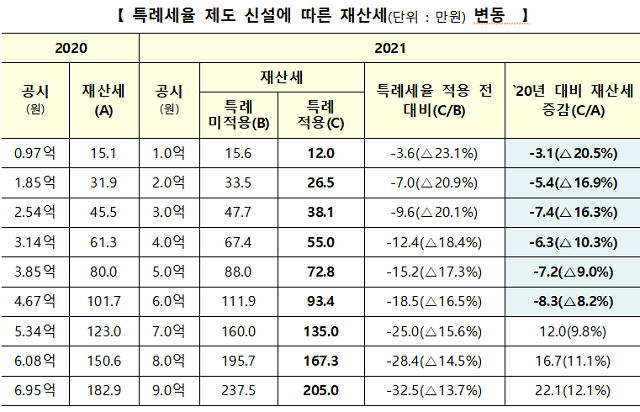 공시가격이 6억9500만원에서 9억원으로 오른 단독주택의 경우 특례가 미적용될 경우 재산세가 올해 182만9000원에서 237만5000원으로 29.9%나 오른다. 하지만 특례가 적용될 경우 205만원만 부과돼 13.7%가 줄어드는 효과가 나타난다.