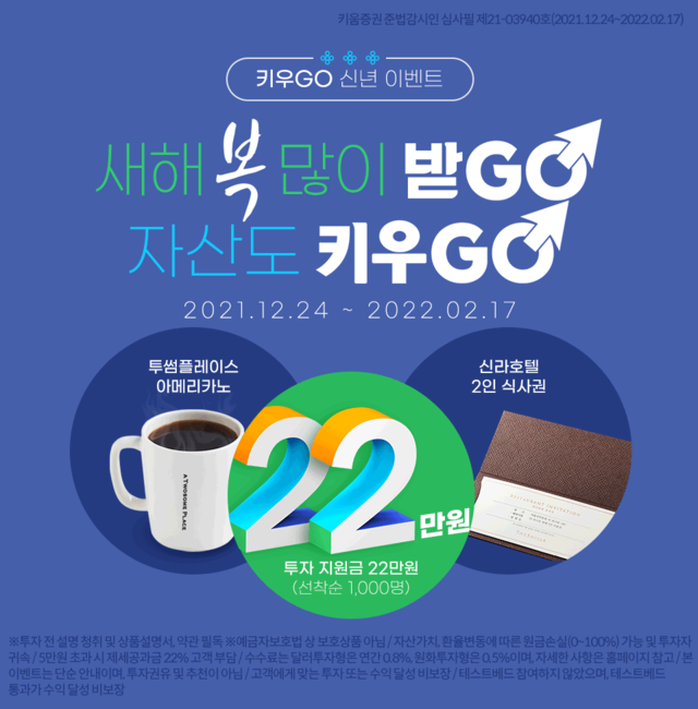 키움증권이 인공지능(AI) 투자 솔루션 ‘키우GO’ 서비스의 가입 고객 및 투자 목표설계 체험 고객 대상으로 경품을 지급하는 이벤트를 실시한다고 24일 밝혔다.키움증권은 내년 2월 17일까지 키우GO 신년 이벤트를 진행한다.이벤트 기간 내 키우GO 랩(Wrap) 상품을 500만원 이상 신규 가입하거나 추가 납입하는 고객 대상으로 선착순 1000명에게 투자 지원금 22만원을 키우GO 계좌로 지급한다. 목표설계 체험만 해도 이벤트 신청자 전원에게 투썸플레이스 아메리카노 기프티콘을 제공한다.기존 목표설계 체험 고객도 이벤트 기간 내 신규 목표설계 체험 시 참여할 수 있다. 목표설계 후 친구에게 카카오톡으로 5회 이상 공유하는 고객을 대상으로 추첨을 통해 신라호텔 더 파크뷰 2인 식사권도 지급한다.키우GO는 인공지능이 고객의 자산을 키워간다(GO)는 뜻이다. 키움증권이 자체개발한 인공지능 로보어드바이저가 투자목표와 투자기간·투자예정금액·투자자 성향 등을 종합적으로 분석해 현재 금융시장 상황에 적합한 자산배분 포트폴리오를 제공하는 투자일임 서비스다.기존의 투자성향 설문만을 통해 상품을 추천하는 방식과는 차별화되는 것이 특징이다.키우GO 서비스는 모바일 영웅문S, HTS 영웅문4, 홈페이지 등에서 제공된다. 자세한 내용 및 문의는 키움증권 홈페이지 또는 키움금융센터를 통해 확인할 수 있다.