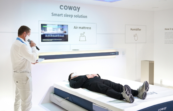 삶의 가치를 향상시키고 차별화된 경험을 제공하는 '스마트 라이프 솔루션'이다.가장 주목받은 제품은 1분기 국내 출시를 앞두고 있는 '스마트케어 에어매트리스'.이번 전시에서 최초 공개한 이 제품은 편안한 수면 환경을 제공하기 위해 매트리스 안에 있는 코웨이만의 독자 특허 기술을 담았다. 사용자의 체형과 수면 자세 등에 따라 공기압의 변화를 감지해 본인에게 최적화된 경도를 자동으로 조절해주는 혁신 제품으로 최근 수면 시장이 급부상하는 만큼 참관객들의 눈길을 끌었다.코웨이만의 독자 특허 기술로 개발한 코웨이 에어셀은 내구성과 탄성이 뛰어나 언제나 새 것처럼 사용할 수 있다.혁신 기술력의 산물인 에어셀이 탑재된 스마트케어 에어매트리스는 매트리스 시장에 새로운 바람을 일으켜 시장 판도를 뒤흔들 것으로 평가 받았다. -