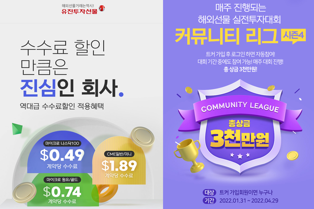 유진투자선물은 새해를 맞아 수수료 할인·실전투자대회 등 '성공 투자 기원 이벤트'를 진행한다고 10일 밝혔다.우선 이날부터 3월 31일까지 유진투자선물 계좌 신규 개설 고객과 작년 6월 이후 거래가 없는 휴면 개인 고객이 소셜 트레이딩 플랫폼 '트레이딩 커뮤니티'에 가입하면 신청일로부터 60거래일간 수수료 할인 혜택을 받는다.수수료 할인 혜택에 따라 이벤트 대상자들은 CME 마이크로 지수·통화 계약당 0.49달러, CME 마이크로 에너지·귀금속 계약당 0.74달러, CME 지수·에너지·귀금속·통화·금리 계약당 1.89달러 등 업계 최저 수준의 수수료 혜택을 누릴 수 있다. 거래 시작 전 24시간 연락 데스크로 전화 신청하면 즉시 할인된 수수료가 적용된다.이달 31일부터 트레이딩 커뮤니티 회원 대상으로 총상금 3000만원 규모의 실전투자대회 ‘커뮤니티 리그 시즌4’도 진행한다. 회원은 별도 신청 없이 대회에 자동 참여되며, 수익률 리그와 승점 리그로 나눠 3개월간 진행된다.수익률 리그에선 매달 한 차례씩 최고 수익률 투자자에게 총 세 차례씩 500만원 상금이 지급된다. 승점 리그는 수익일수, 수익거래 건수, 거래일수 등 각각의 항목에 승점을 매겨 가장 높은 승점을 획득한 투자자를 선정한다. 각 회차별 총상금은 100만원이다.내달 1일부터 오는 12월 30일까지 트레이딩 커뮤니티 회원 중 해외선물 300계약 이상 거래 고객 대상으로 매월 20명을 추첨해 5만원씩 투자지원금을 지급하는 이벤트도 마련된다.한편 트레이딩 커뮤니티는 기술적, 펀더멘탈 분석과 함께 회원 간 실시간 거래정보 공유를 통한 면밀한 시장 분석을 지원하기 위해 유진투자선물에서 자체 출시한 서비스다.이 회사 실거래 계좌를 보유하고 계좌잔고가 50만원 이상인 투자자라면 별도의 비용 없이 무료로 이용 가능하며, HTS와 MTS에서 만나볼 수 있다.