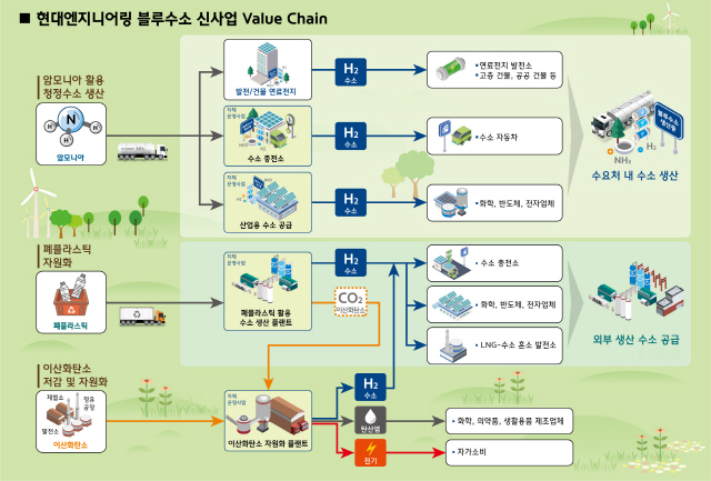현대ENG이 추진하는 폐플라스틱 활용 수소생산기술은 폐플라스틱을 원료로 열분해 및 가스화공정을 통해 수소를 생산하는 것으로 폐플라스틱 열분해 과정에서 발생한 이산화탄소는 앞서 이산화탄소 포집 및 자원화기술을 적용해 수소, 탄산염 등으로 재활용된다.