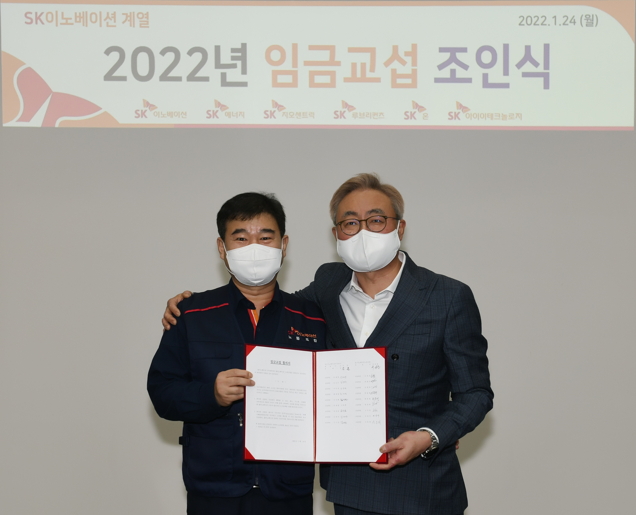 SK이노베이션 노사가 새해 들어 첫 노사 상생, 협력사 상생 소식을 알렸다. 6년 연속 임협을 무교섭 타결했다.SK이노베이션 노사가 24일 2022년 임금협상을 마치고 상생 기금을 협력사에 전달했다.이날 SK이노베이션은 울산CLX에서 김준 부회장과 이성훈 노동조합위원장 등이 참석한 가운데 ‘2022년도 임금교섭 조인식’을 진행했다고 밝혔다.회사는 지난 13일 임금교섭 상견례 자리에서 노사가 곧바로 잠정합의안을 도출해냈다고 설명했다. 이어 20일 있었던 조합원 대상 찬반투표에서 참여 조합원 87.3%의 찬성으로 올해 임금협상이 타결됐다.2017년 SK이노베이션 노사는 임금인상률을 전년도 소비자물가지수에 연동하기로 합의한 바 있다. 이에 따라 올해 임금인상률도 전년도 소비자물가지수인 2.5%로 확정됐다.노사가 정한 이같은 원칙을 6년째 고수해온 것과 관련해 회사는 "밀고 당기기식의 교섭 방식에서 벗어나 매년 상견례와 동시에 잡정합의에 이르는 시스템을 구축해 선진 노사문화를 정착시켰다"고 말했다.김 부회장은 "6년째 노사간의 약속을 지켰고 높은 찬성율을 통해 구성원의 신뢰와 지지를 다시 한번 확인할 수 있었다"며 "노사가 힘을 합쳐 구성원이 자부심을 가질 수 있는 더 강하고 더 좋은 회사를 함께 만들어 나가자"고 당부했다.SK이노베이션 노사는 같은날 '2022 SK이노베이션 협력사 상생기금 전달식'을 열고 총 35억7000만원을 71개 협력사 직원 5292명에게 전달했다.앞서 노사는 2017년 임단협에서 구성원 1%행복나눔기금에 합의하고 그 절반을 협력사 구성원을 위해 사용하기로 합의했다.