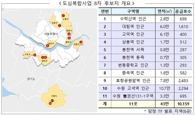 이번에 선정된 도심복합사업 후보지는 서울 9곳·경기 2곳 총 11곳(역세권 8곳·저층주거 3곳)으로 1만호 규모다.