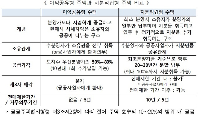 또한 분담금 등 부담여력이 부족한 토지주에게는 우선분양가의 50%만 부담(시세 25~35% 수준)해도 소유권을 취득할 수 있는 이익공유형주택과 최초 분양가액을 20~30년간 분할납부해 소유지분을 취득하는 지분적립형주택 등을 공급하기로 했다.