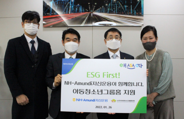 NH아문디자산운용은 임직원 봉사단체 나눔과 봉사모임은 지난26일 사단법인 ‘한국아동청소년그룹홈협의회’에 후원금을 전달했다고 27일 밝혔다.이는 농협금융의 사회가치 및 녹색금융을 위한 ‘ESG 애쓰자’ 캠페인 실천의 일환으로 임직원의 자발적 나눔과 기부에 회사도 함께 동참했다.나눔과 봉사모임은 지난 2018년말 임직원들이 어려운 이웃에게 사랑을 전하고 사회에 건전한 기여를 하기 위해 자발적으로 결성됐다. 특히 아동 청소년에게 도움이 되는 봉사활동을 꾸준히 해왔다. 지난 2019년 마포구 서진지역 아동센터를 시작으로, 한사랑장애영아원에 지속적인 봉사활동을 펼쳤다.이번 후원은 청년으로 성장해 보호가 종료되는 아동의 자립을 돕기 위해 진행됐다. 모임 관계자는 “청년이 돼도 사회에서 홀로서기란 쉽지 않은 환경에서 작은 도움이라도 줄 수 있는 방법을 찾아왔다”며 “아동이 성장했던 그룹홈과 연계해 유대감을 지속할 수 있도록 돕겠다”고 밝혔다.박학주 대표는 “임직원이 십시일반하는 자발적 봉사활동 취지에 공감해 회사에서도 공동지원을 했다”고 말하며 “ESG를 최우선적으로 고려하는 회사의 비전 ‘ESG 퍼스트’를 적극 실천하겠다”고 밝혔다.