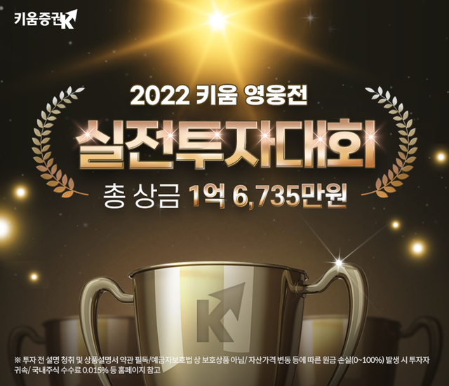 키움증권은 7일부터 2022년 제1회 키움 영웅전 실전투자대회 신청을 접수한다고 밝혔다. 대회 신청은 3월 27일까지 가능하며, 대회기간은 2월 21일부터 4월 8일까지 진행한다.이번 대회는 주식리그, 선물옵션리그로 나눠 진행되며 총 1억6735만원의 상금이 증정될 예정이다.주식리그는 예탁자산별로 1억클럽, 3000클럽, 500클럽 및 100클럽으로, 선물옵션은 단일클럽으로 구성된다.수익률 1위에게는 각 1억클럽 5000만원, 3000클럽 2000만원, 500클럽 800만원, 100클럽 100만원의 상금이, 선물옵션리그 1위에게는 300만원의 상금이 지급된다.수익금 1위에게는 각 1억클럽 1500만원, 3000클럽 500만원, 선물옵션리그 수익금 1위에게는 100만원의 상금이 주어진다.대회기간 동안 주식 거래 이벤트도 함께 진행한다. 매주 주식거래금액 1위에게 현금 50만원을 증정하며, 매주 일정 거래금액을 충족한 고객을 대상으로 추첨해 백화점상품권, 현금 등을 지급한다.