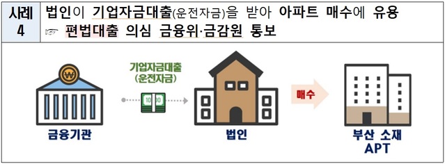 이 밖에 부산소재 아파트를 29억원에 매수하면서 기업자금대출(운전자금용도)로 받은 30억원중 일부를 사용한 사례도 적발됐다.