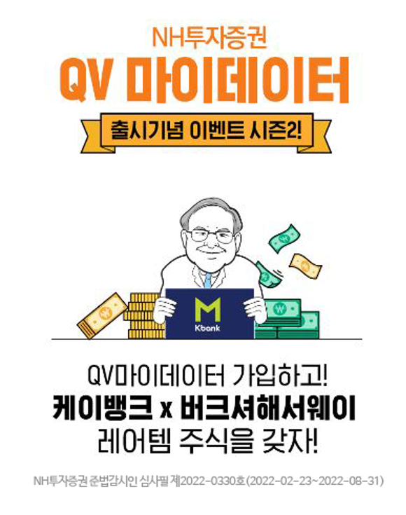 NH투자증권은 QV 마이데이터 서비스 신규 가입 고객과 기존 이용고객들을 대상으로 마이데이터 서비스 출시기념 이벤트 시즌2를 실시한다고 10일 밝혔다.이번 이벤트는 NH투자증권 QV 개인 고객이면 누구나 참여 가능하며, 6월 30일까지 진행된다.이 회사는 ‘모든 자산관리의 시작’이란 슬로건으로 지난 1월 마이데이터 서비스를 오픈, 통합자산조회·투자성과리포트·나의 소비 등 크게 3가지 분류로 서비스를 시행하고 있다.우선 QV 모바일트레이딩서비스(MTS)에서 최초로 마이데이터 서비스 등록을 완료한 고객 모두에게 케이뱅크 비상장주식 2주를 지급한다. 이벤트 기간 내에 가입한 고객에게 지급하며, 가입한 달로부터 익월 둘째 주 수요일에 고객 계좌로 지급할 예정이다.QV 마이데이터 가입 고객 중 최초로 해외주식 100만원 이상 거래 시 버크셔헤서웨이 A주(BRK.A) 0.005%(최대 3만원 상당, 소수점 지급)를 선착순 2만명에게 지급한다. 이는 워렌버핏이 운영하는 세계에서 가장 비싼 주식이며, 업계에서 유일하게 NH투자증권에서만 소수점 거래가 가능한 종목이다.현금 또는 금융상품 등 자산 1억원 이상을 NH투자증권 QV 계좌로 이전하는 선착순 1000명 고객에게 연 5%(세전) 특판 RP(91일물) 가입 혜택을 제공한다. QV 마이데이터 이용고객 기준이며, 1인당 1000만원 한도로 매수 가능하다.유현숙 WM사업부 대표는 “당사 마이데이터 서비스는 작년 12월 시범 서비스 출시 이후 다양한 연령대의 고객이 꾸준히 가입해서 이용하고 있으며, 앞으로도 많은 고객이 당사의 차별화된 서비스를 경험하기를 바라는 마음으로 이번 이벤트를 준비했다”며 “향후 NH투자증권이 제공하는 모든 서비스는 고객 가치를 최우선으로 고려해 제공할 것”이라고 밝혔다.